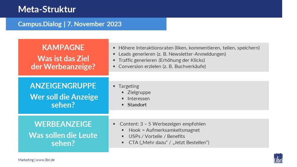 AT: Genau, dafür musst Du Deine URL verifizieren lassen, die Social Media Kanäle mit der Meta Business Suite verknüpfen und dort im Werbeanzeigenmanager Deine Zahlungsinformationen hinterlegen. Hilfreich sind der Meta-Hilfebreich für Unternehmen und die Meta-Richtlinen, die eine Einführung in die Werbestandards geben. Letztlich musst Du Dich in der Meta Business Suite einfach ein bisschen durchklicken, um die Struktur erst einmal zu verstehen. Dann kann eine Kampagne eingerichtet und dabei unter anderem auch festgelegt werden, was deren Ziele sein soll.